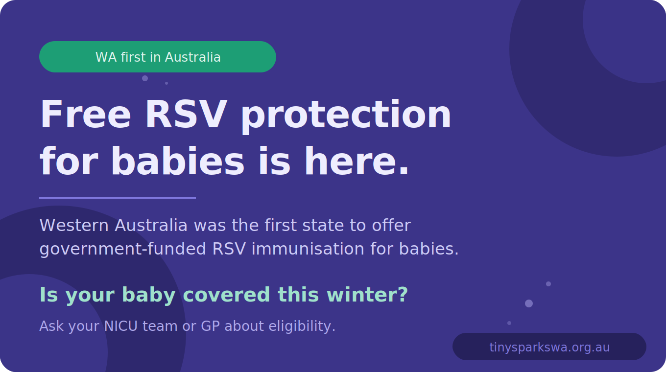 Information on this page is provided for general guidance only and is not a substitute for advice from your NICU team, paediatrician, or GP. Eligibility criteria for WA RSV prevention programs may change each season. Always confirm current eligibility with your healthcare provider. Last reviewed: April 2026.